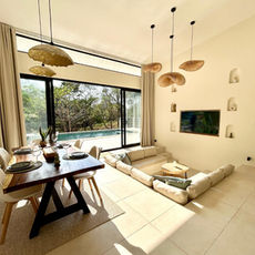 Nichée dans un écrin de verdure tropicale, cette maison contemporaine a été pensée comme une continuité naturelle de son environnement. Grâce à ses larges baies vitrées, les espaces de vie s’ouvrent sur la piscine et profitent d’une lumière généreuse.